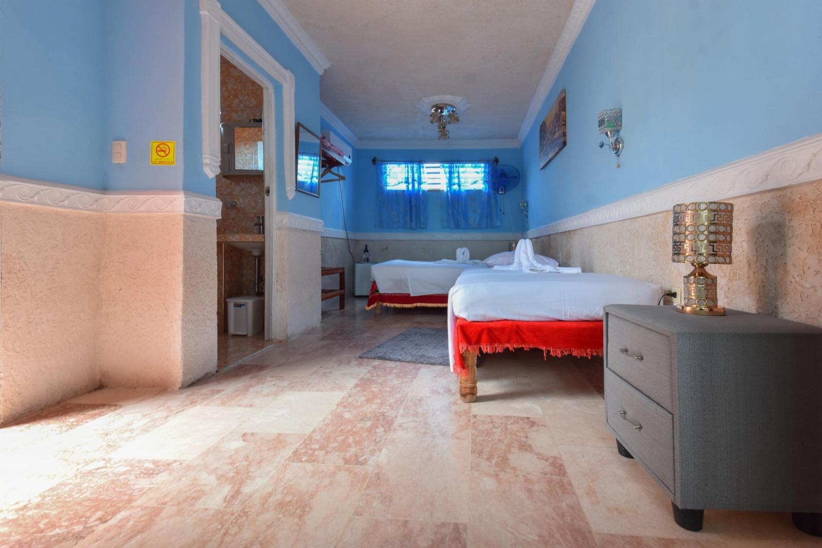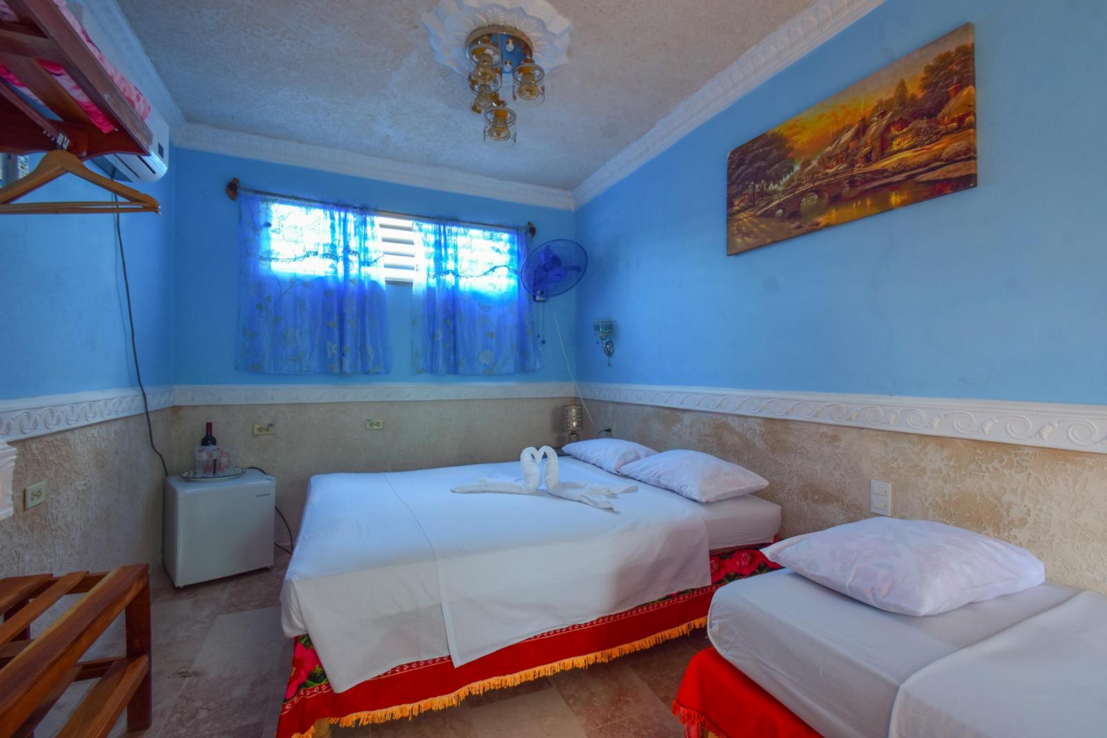 Room with capacity for 3 people (1 double bed + 1 single bed). Equipped with air conditioning, private bathroom, Wi-Fi signal, 120V and 240V electricity, safe, hair dryer and mini bar.